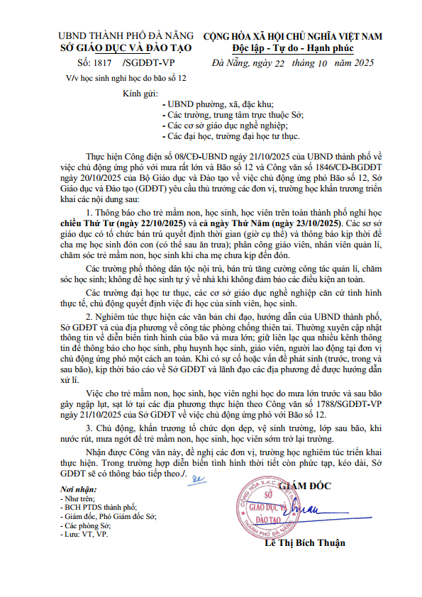 Thực hiện Công điện số 08/CĐ-UBND ngày 21/10/2025 của UBND thành phố vềviệc chủ động ứng phó với mưa rất lớn và Bão số 12 và Công văn số 1846/CĐ-GDĐTngày 20/10/2025 của Bộ Giáo dục và Đào tạo về việc chủ động ứng phó Bão số 12. Ngày 22/10/2025, Sở Giáo dục và Đào tạo thành phố Đà Nẵng ban hành Công văn số 1817/SGDĐT-VP về việc học sinh nghỉ học do bão số 12.