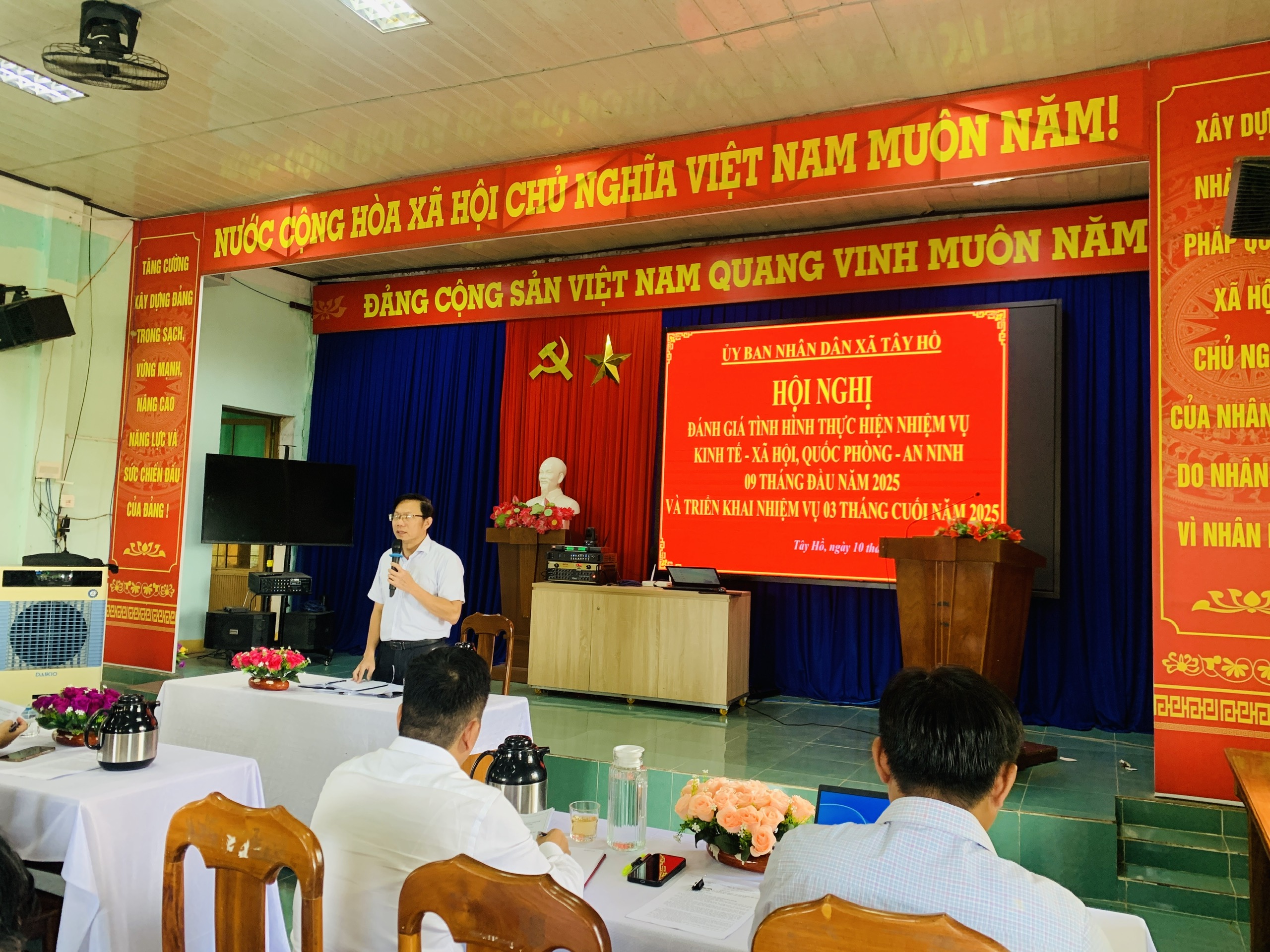 Nhiệm vụ, giải pháp 3 tháng cuối năm 2025, xã Tây Hồ triển khai đồng bộ các giải pháp để hoàn thành nhiệm vụ phát triển kinh tế - xã hội đề ra. Tập trung chỉ đạo, triển khai thực hiện các nội dung theo chương trình công tác trọng tâm trình cấp ủy, Ban thường vụ Đảng ủy xã; Chương trình số 01/CT-UBND ngày 15/8/2025 của UBND xã về công tác trọng tâm 06 tháng cuối năm 2025. Tăng cường cải cách hành chính, chuyển đổi số, an sinh xã hội, bảo đảm quốc phòng - an ninh, tạo tiền đề phát triển bền vững trong năm 2025 và các năm tiếp theo; xây dựng Chương trình hành động và kế hoạch triển khai kinh tế - xã hội giai đoạn 2026 – 2030...