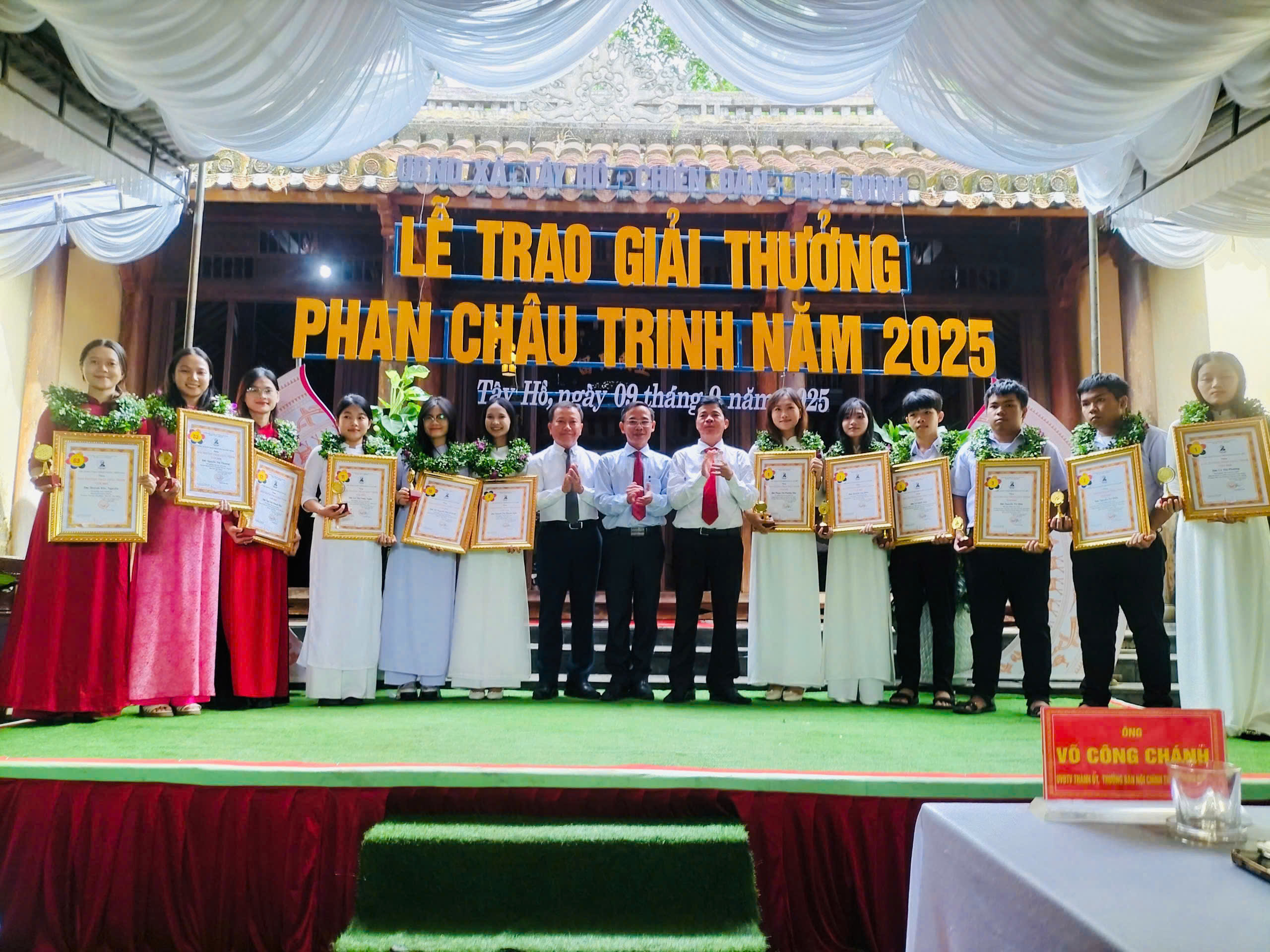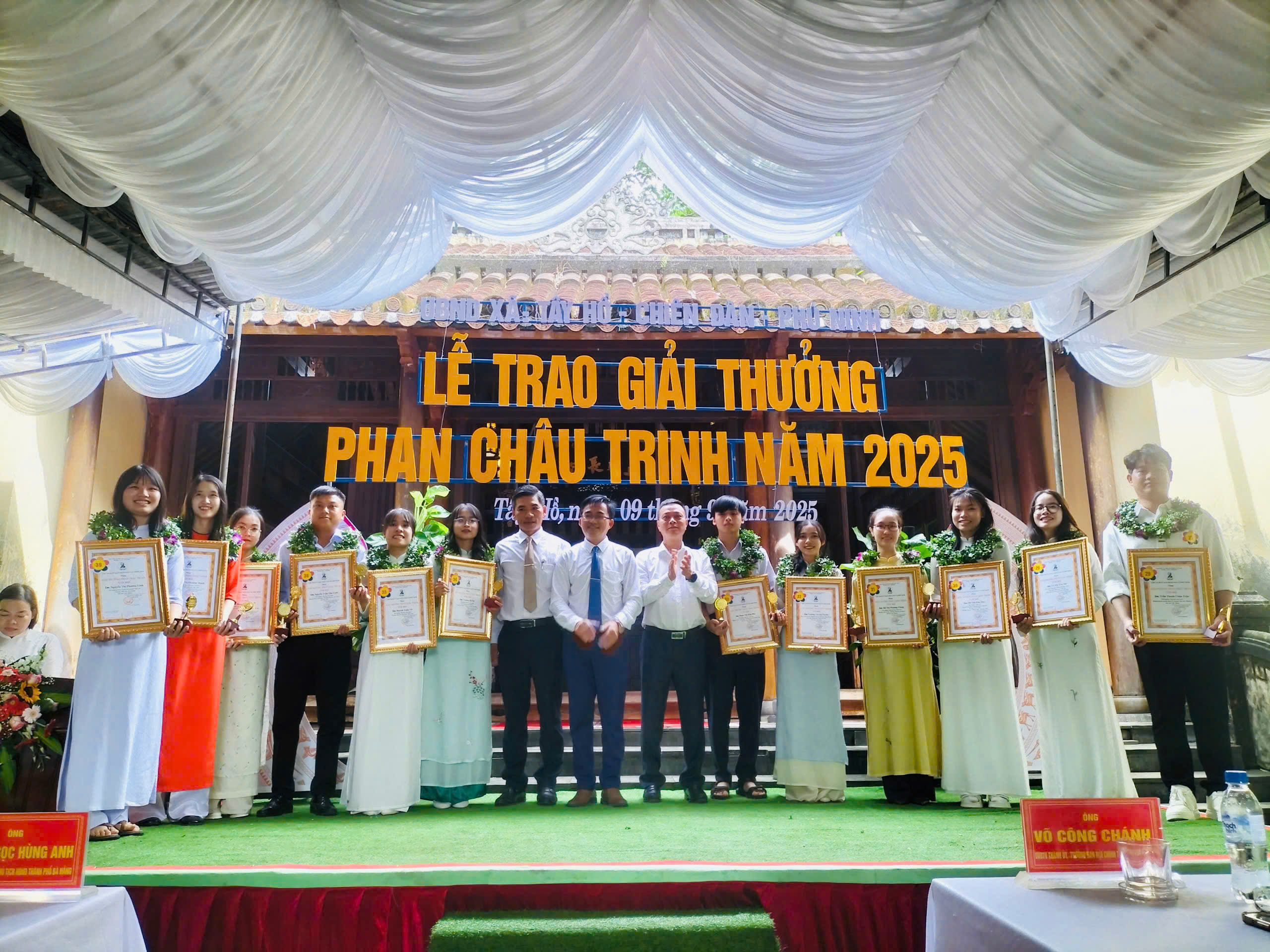 Ông Đoàn Hồng Ngọc – Vụ trưởng vụ địa phương II, Ban Nội chính Trung ương và lãnh đạo xã Chiên Đàn, Phú Ninh trao giải thưởng Phan Châu Trinh cho các sinh viên tốt nghiệp loại xuất sắc