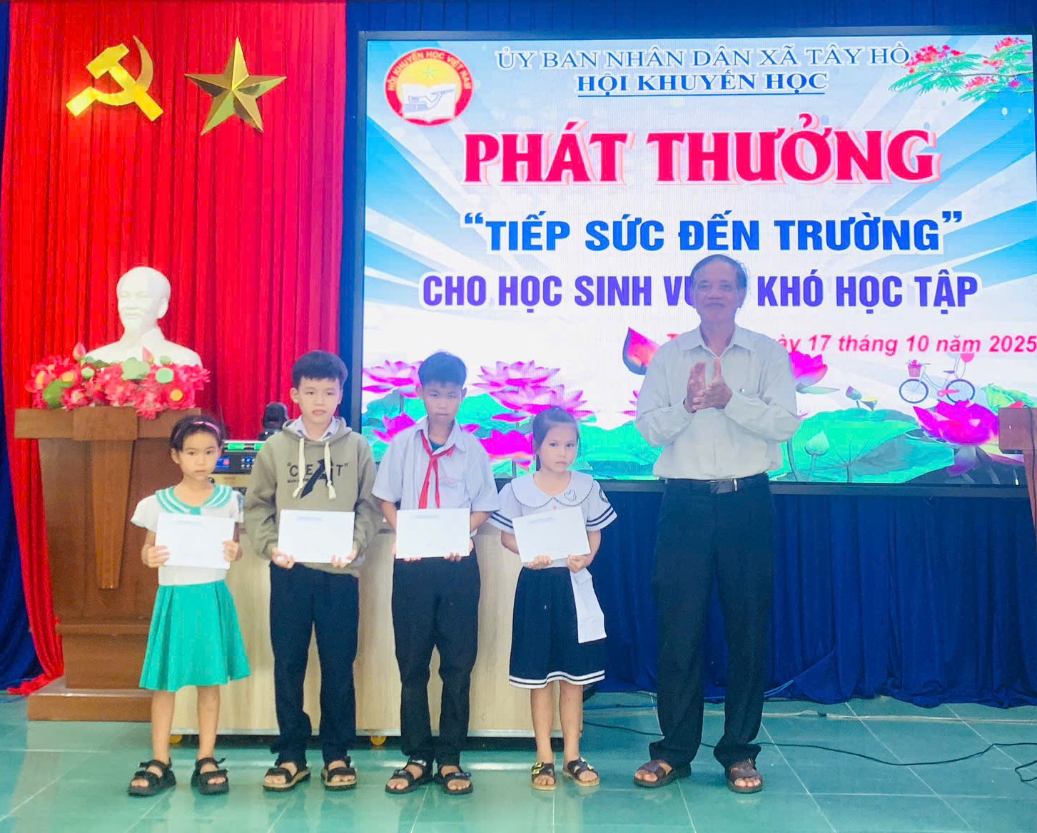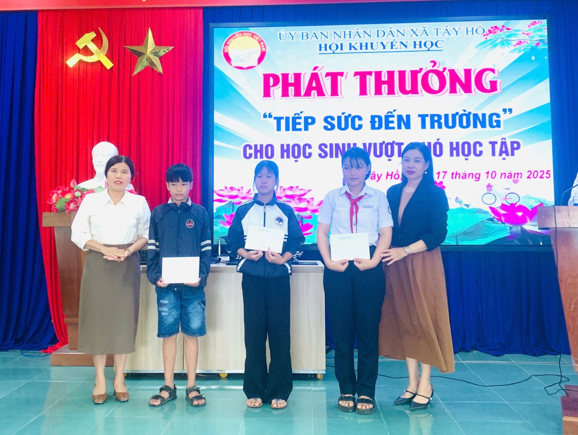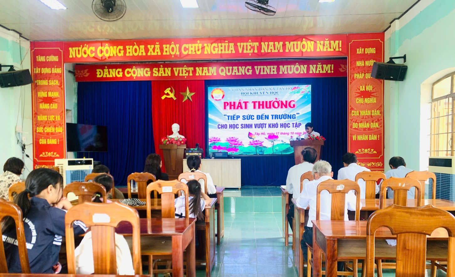 Tại chương trình, Hội Khuyến học xã đã trao 9 suất học bổng “Tiếp sức đến trường” cho các em học sinh. Mỗi suất học bổng có giá trị 1,5 triệu đồng, do các mạnh thường quân là con em của xã Tây Hồ trao tặng.
