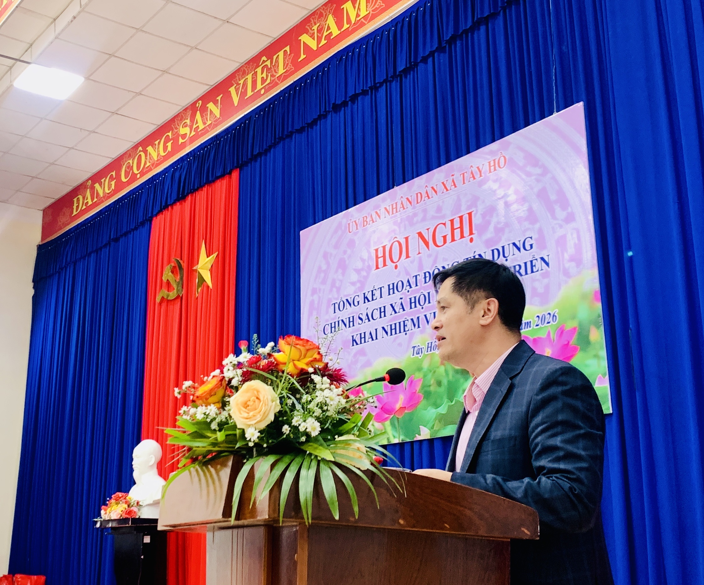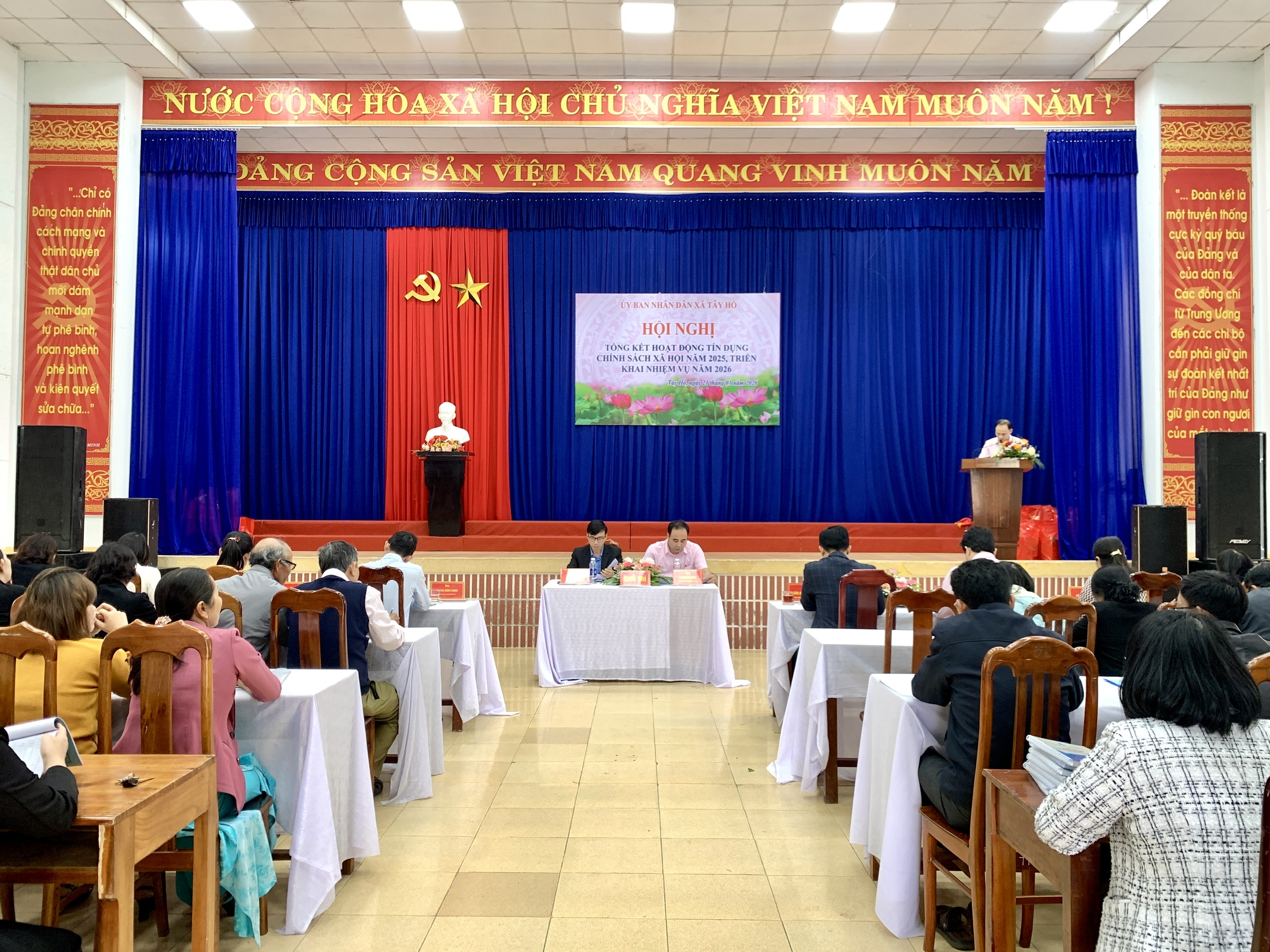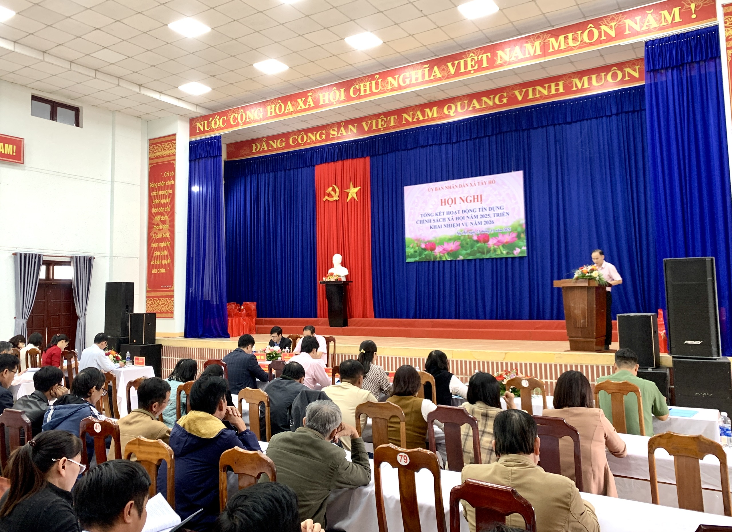 Tham dự hội nghị có các đồng chí: Đoàn Ngọc Chung - Giám đốc Chi nhánh NHCSXH thành phố Đà Nẵng, Nguyễn Dương Quang - Phó Giám đốc Chi nhánh NHCSXH thành phố Đà Nẵng. Về phía xã Tây Hồ có đồng chí Huỳnh Xuân Chính- Bí thư Đảng ủy, Chủ tịch HĐND xã; các đồng chí Thường trực Đảng uỷ, Chủ tịch Ủy ban MTTQ, Trưởng Công an, lãnh đạo các cơ quan, đơn vị, hội đoàn thể xã; Trưởng các thôn; 59 Tổ trưởng Tổ Tiết kiệm và vay vốn (TK&VV) trên địa bàn xã; lãnh đạo và cán bộ Phòng giao dịch NHCSXH Phú Ninh.