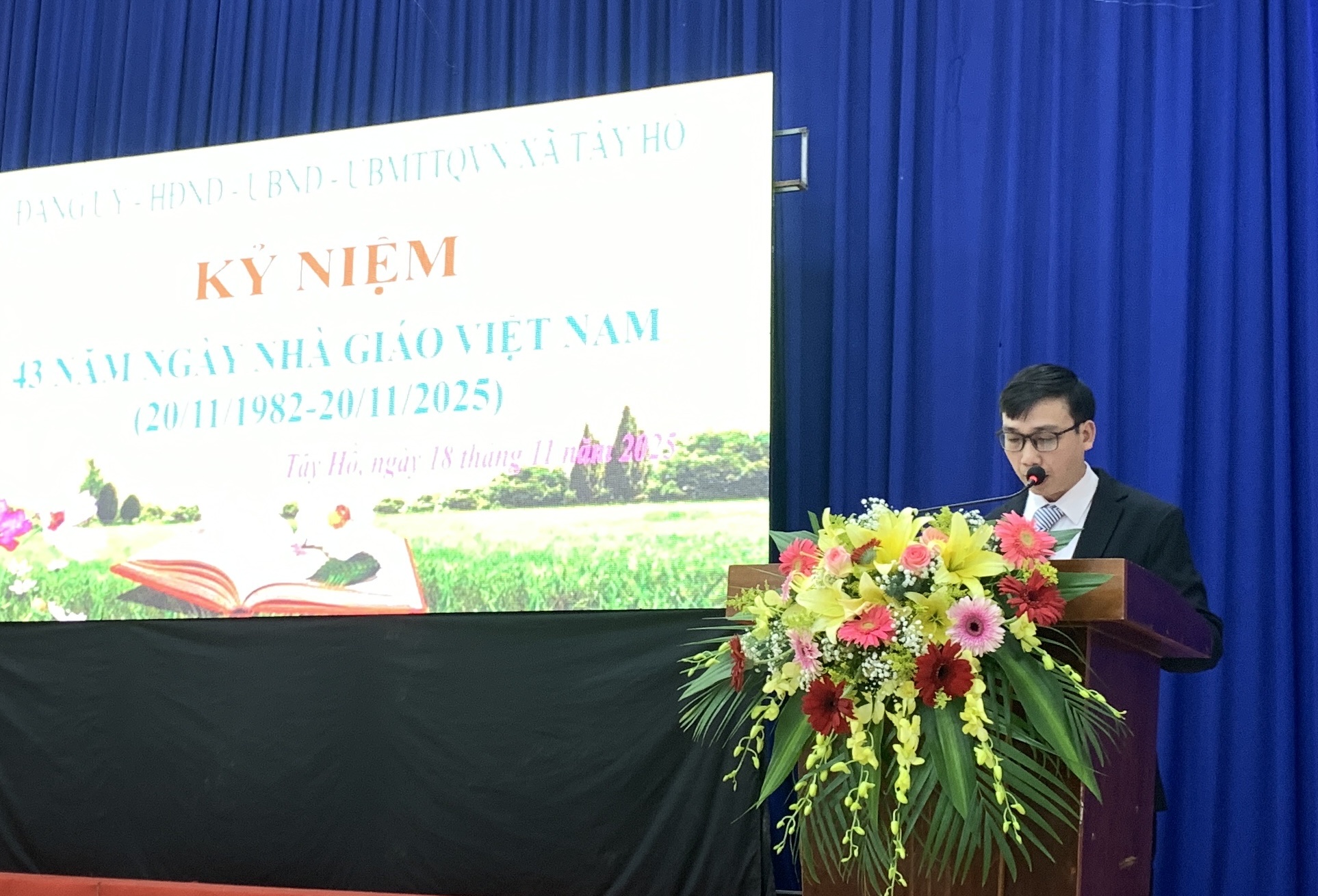 Phát biểu tại buổi sinh hoạt, đồng chí Phan Văn Ba – Phó Chủ tịch UBND xã gửi lời chúc mừng tốt đẹp nhất tới toàn thể đội ngũ nhà giáo nhân dịp kỷ niệm 43 năm Ngày Nhà giáo Việt Nam. Đồng chí ghi nhận và biểu dương tinh thần nỗ lực, trách nhiệm và những đóng góp to lớn của các thầy cô giáo trong thời gian qua. Đồng chí Phó Chủ tịch UBND xã Tây Hồ khẳng định, kỷ niệm ngày Nhà giáo Việt Nam 20/11 năm nay có nhiều nét đặc biệt. Chưa bao giờ ngành giáo dục và đào tạo có được vị thế, được trao truyền sứ mệnh và được quan tâm chăm lo như hiện nay. Giáo dục và đào tạo được xác định là quốc sách hàng đầu, quyết định tương lai dân tộc. Nhà giáo được coi là động lực để phát triển giáo dục, là nhân tố quyết định chất lượng của giáo dục. Nhiều chính sách mới đã được Đảng và Nhà nước ban hành để phát triển đội ngũ nhà giáo. Đó là niềm vui to lớn, là sự động viên khích lệ những người làm công tác giáo dục.