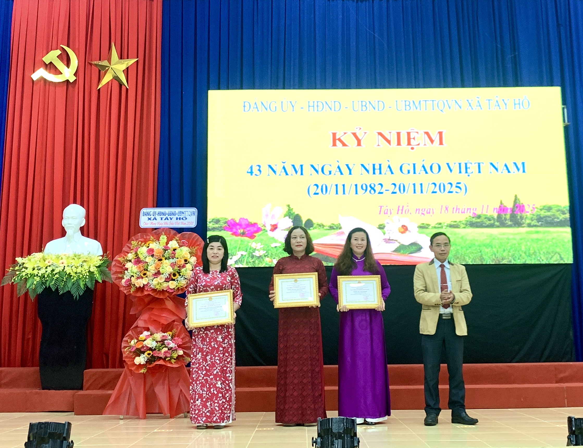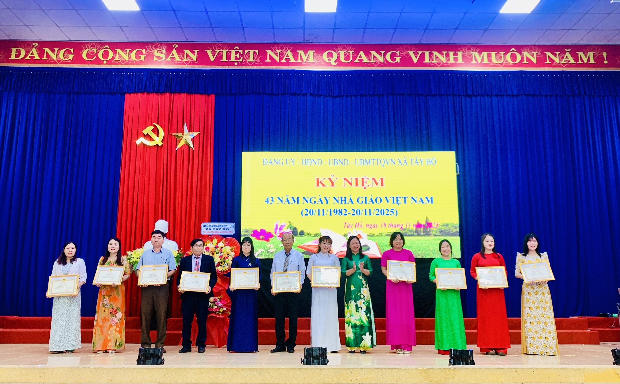 Tại đây, UBND xã Tây Hồ đã tuyên dương khen thưởng 03 tập thể Lao động xuất sắc, 02 cá nhân được nhận Bằng khen của Chủ tịch UBND thành phố, 09 tập thể Lao động tiên tiến, 115 chiến sĩ thi đua cơ sở và 02 tập thể, 17 cá nhân được Chủ tịch UBND xã tặng Giấy khen vì đã đạt thành tích xuất sắc trong năm học 2024-2025.