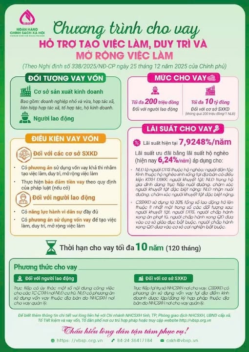 Nghị định này có hiệu lực thi hành kể từ ngày 01/01/2026, góp phần thể chế hóa chủ trương phát triển kinh tế tư nhân tại Nghị quyết số 68-NQ/TW ngày 04 tháng 5 năm 2025 của Bộ Chính trị và phù hợp với Chiến lược phát triển Ngân hàng Chính sách xã hội đến năm 2030 “nâng mức cho vay, thời hạn cho vay phù hợp với mục tiêu các chương trình mục tiêu quốc gia và mục tiêu phát triển kinh tế -xã hội đất nước”.